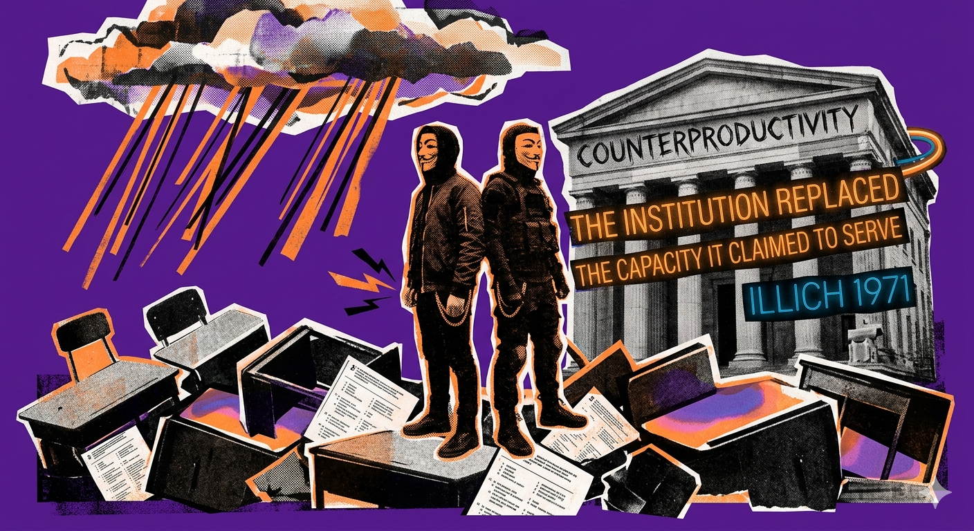Ivan Illich identified the pattern fifty years ago and called it counterproductivity: beyond a threshold, institutions designed to serve a purpose begin to undermine it. Schools decrease learning above a certain scale. Hospitals decrease health. Police decrease safety. The observation was not cynical — it was structural. Large institutions require self-perpetuation as their primary operating logic. Serving the stated mission is secondary to maintaining the budget, the headcount, the regulatory territory, and the political relationships that guarantee survival. The mission drift is not corruption. It is the predictable output of the incentive architecture.