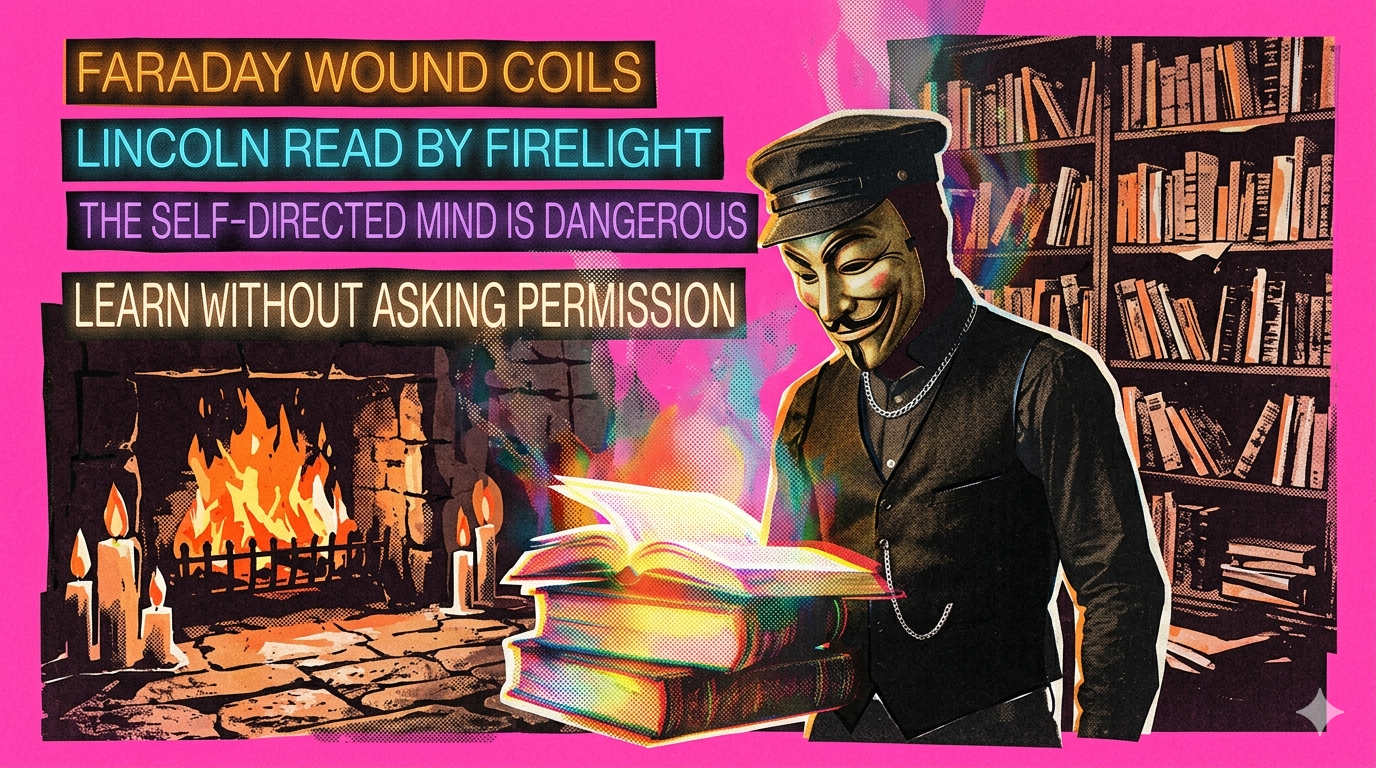 The autodidact tradition in every domain demonstrates what is possible outside institutional education. Benjamin Franklin, who attended school for two years and became the most accomplished American of the 18th century. Abraham Lincoln, who educated himself by firelight with borrowed books and became one of the most rhetorically sophisticated leaders in political history. Michael Faraday, bookbinder's apprentice, who taught himself physics and chemistry through reading and experiment and discovered electromagnetic induction, the foundation of all electrical generation. None of these figures were exceptional because of institutional education. They were exceptional in spite of its absence — because the absence forced them to develop the one skill that institutional education systematically suppresses: the capacity to learn without external direction.