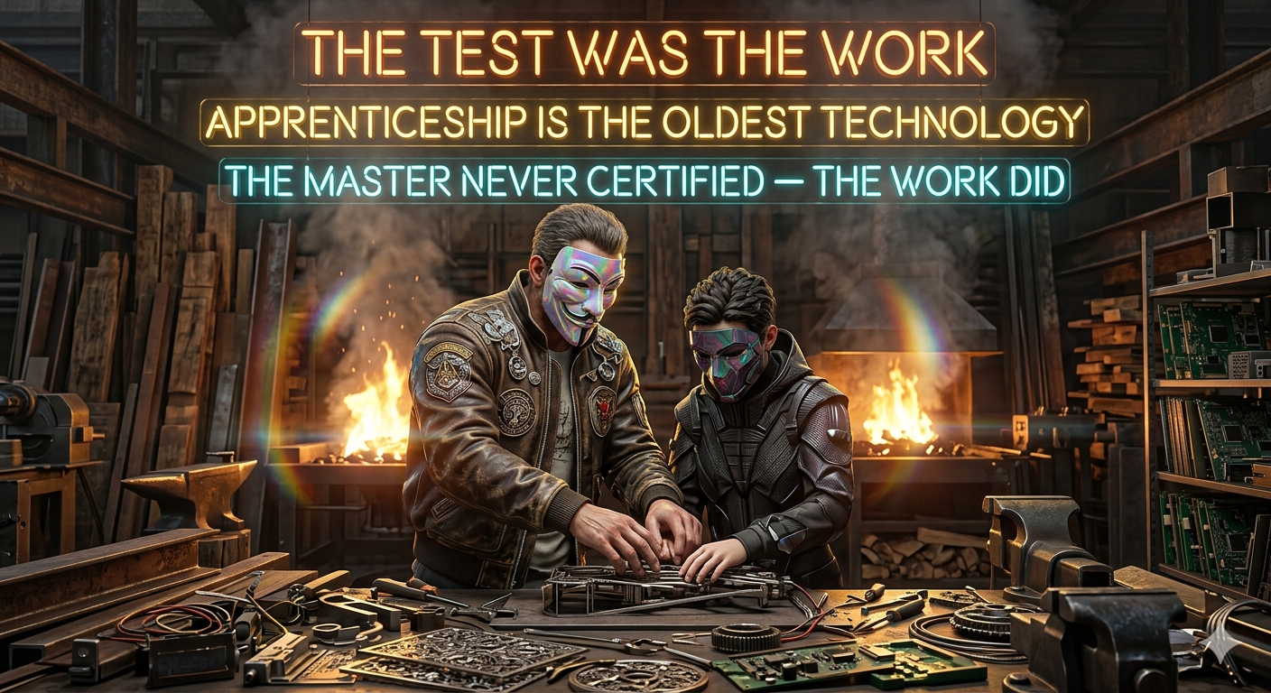 The apprenticeship is the oldest and most effective system for transmitting practical competence ever developed. For the vast majority of human history, skills were passed from those who possessed them to those who would inherit them through direct observation, guided practice, and progressive responsibility — not through lecture, examination, and certification. The master craftsman did not certify the apprentice's knowledge of carpentry theory. The apprentice built things, increasingly complex things, under decreasing supervision, until they could build anything the master could build. The test was the work, not the exam.